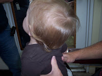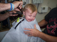 Well. My baby is no longer a baby…atleast, according to the “My First Haircut” Certificate he got today. I finally broke down and took my sweet little boy to have his beautiful little light brown curls chopped off. I was very proud of myself. I’m such an emotional person. I figured I would cry. But I didn’t. I stood there, camera in hand, and smiled as my sweet little baby graduated into toddler/boyhood.