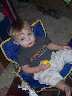 His Grandmommy bought him this super cute “Bass Pro Shop” lounge chair for Christmas. He sits in it to watch his cartoons in the mornings. {Oh yea, do you notice the yellow ball in his hand? Told ya!}